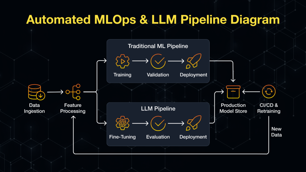 • Scaling large language models (LLMs): Today’s LLMs—such as GPT-4, Gemini, and Claude—are powered by machine learning and are managed at scale using MLOps/LLMOps pipelines to ensure smooth deployment and regular enhancements.