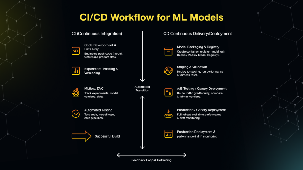 CI/CD is common in software development, but ML introduces new challenges. Mature MLOps adapts CI/CD pipelines by including continuous training and validation. If a new model fails, AI model rollback strategies rollback startegies restores stability. Model-aware testing checks the code, data, and predictions to help teams catch issues before production.