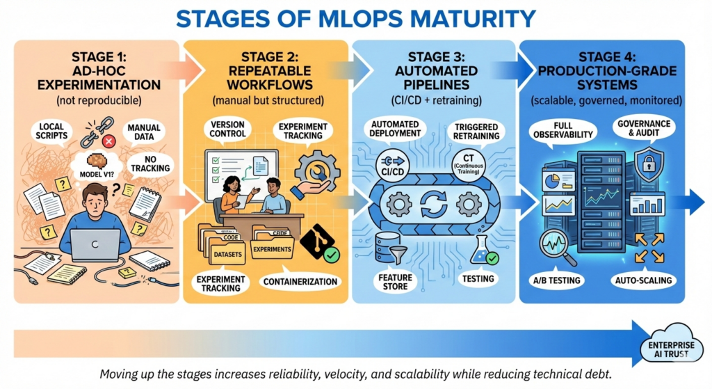 Teams usually start with ad‑hoc experiments, move to automated pipelines, and then build fully governed, scalable systems.